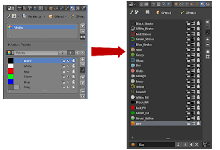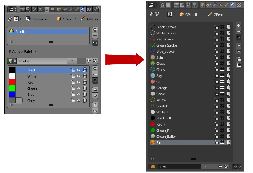 Na versão 2.7, os desenvolvedores inseriram uma paleta de cores para que os animadores 2D pudessem pintar seus projetos. Mas agora eles viram que as cores Grease Pencil são muito mais complexas do que uma cor simples. Com isto eles trocaram a Palettes para Materials. Agora as cores funcionam da mesma maneira que qualquer outro material no Blender, com configurações adicionais exclusivas para Grease Pencil.
